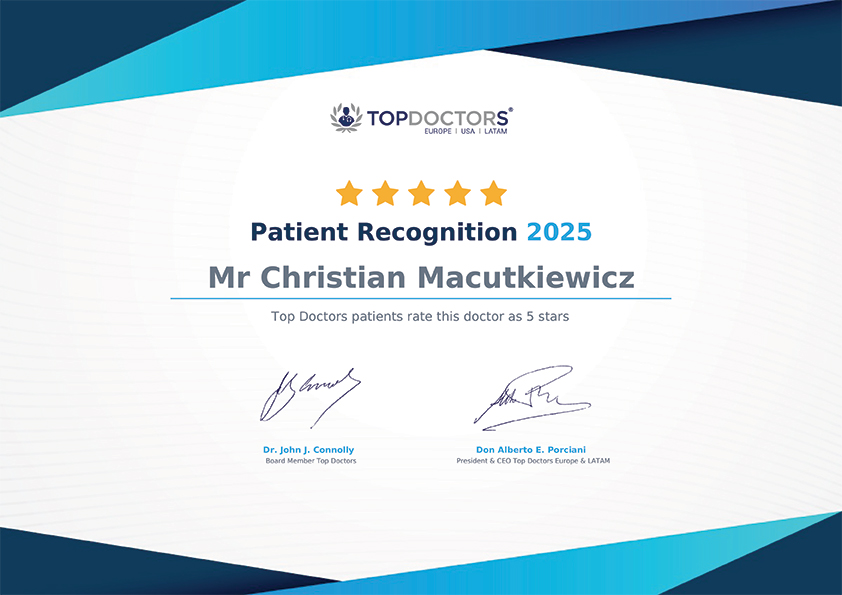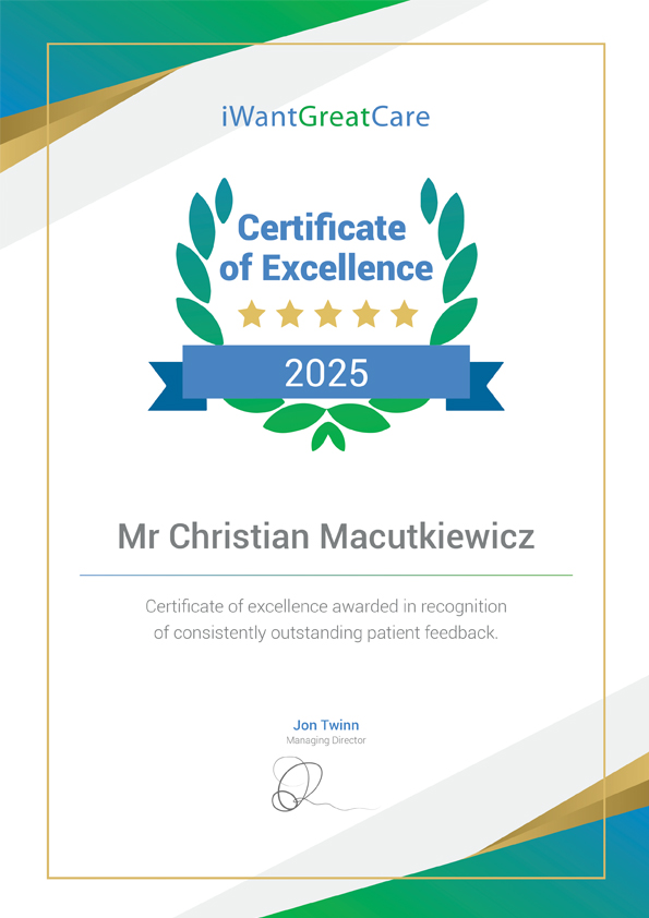 Mr Christian Macutkiewicz was awarded the iWantGreatCare Certificate of excellence, 2025 in recognition of consistently outstanding patient feedback.